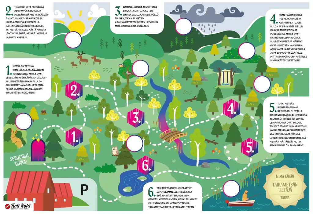 Kolin uusi luontopolku on suunniteltu yhteistyössä rauhoittavia tilakonsepteja suunnittelevan Metsä/Skogenin kanssa ja se sijaitsee Break Sokos Hotel Koli Kylän välittömässä läheisyydessä. – Luontopolku on osa suurempaa Break Sokos Hotel Koli Kylän asiakaskokemuksen uudistusta. Yhteistyö Metsä/Skogenin kanssa on alku sille, miten voimme rakentaa hyvinvointia tukevaa matkailua, Näsärö sanoo.– Uudistuksessa halusimme tuoda esiin luonnon kokonaisvaltaiset terveyshyödyt, koska luonto ei ole vain maisema, vaan hyvinvoinnin lähde, joka tukee mielen tasapainoa. Kolin Taikametsä -retkielämysaktiviteetilla luontoon lähteminen tehdään lapsille helpoksi ja luontoyhteyttä syventäväksi kokemukseksi, kertoo Carita Peltonen Metsä/Skogenista.Luontopolku on noin kilometrin mittainen ja siinä on kuusi toiminnallista aktiviteettipistettä. Pisteillä esimerkiksi tunnistetaan eläinten jalanjälkiä ja lintulajeja sekä rakennetaan koteja metsän asukeille. Polku on mahdollista kiertää omatoimisesti tai lunastaa hotellin vastaanotosta Taikametsä-retkireppu, josta on luontopolun kartta ja oppimista vahvistava tarratehtävä. Kolin Taikametsä -luontopolun varrelle on sijoitettu joensuulaisen taiteilija ja taideterapiaohjaaja Mia Huhtisen toteuttama Ystävämme luonto -taidenäyttely. – On upeaa, että näyttely on suunnattu nimenomaan lapsille, sillä taide kuuluu kaikille. Parasta on, että teokset pystytetään Kolin luonnonhelmaan, sillä taiteen ja luonnon yhdistelmä on terapeuttinen elämys ja maalaukset pääsevät kauniisti esiin vehreässä ympäristössä, kuvailee Huhtinen.Luontopolun avajaisia vietetään 9. lokakuuta kello 15. Polku on aluksi auki lumettomina aikoina.