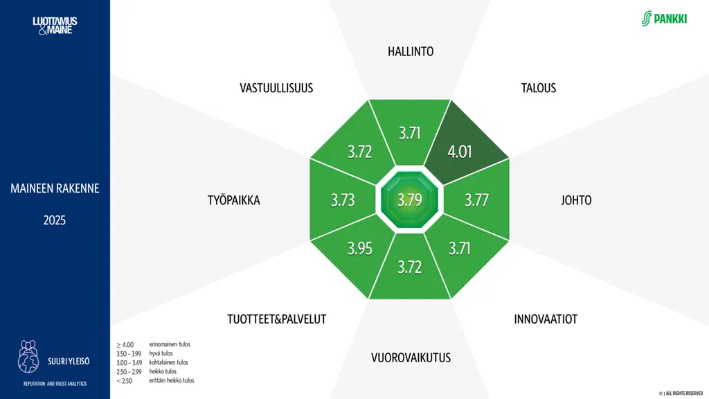 S-Pankin maine on pankkialan paras ja sen kokonaismaine sekä kaikki ulottuvuudet ovat kasvaneet entisestään edellisvuoden tuloksista, selviää tuoreesta Luottamus&Maine 2025 -tutkimuksesta. Tutkimuksen osa-alueista S-Pankin tuloksissa eniten nousivat työnantajuutta, tuotteita ja palveluita sekä taloutta mittaavat arvosanat. Reputation and Trust Analytics selvittää vuosittain Luottamus&Maine –tutkimuksessaan kansalaisten näkemyksiä finanssialan toimijoiden, kuten pankkien ja vakuutusyhtiöiden maineesta. Tänään julkaistussa tuoreessa tutkimuksessa S-Pankin kokonaismaineen arvosana nousi jälleen edellisen vuoden lukemista, ollen 3.79. Kokonaisarvosanallaan S-Pankki pitää paikkansa pankkialan ykkösenä. S-Pankin arvosana kohoaa kirkkaasti myös finanssialan yleistä 3.28 arvosanaa korkeammalle tasolle. “Olemme tällä strategiakaudella panostaneet palveluidemme kehittämiseen asiakasymmärrykseen vahvasti nojaten. On ollut suuri ilo huomata, että työmme kantaa jo hedelmää ja yhä useampi asiakkaamme valitsee meidät pääasialliseksi pankikseen. Myös tuoreet tutkimustulokset osoittavat, että suuntamme on oikea ja luottamus meitä kohtaan on vankistunut entisestään”, S-Pankin asiakkuus- ja brändijohtaja Anni Hiekkanen sanoo. Tutkimuksessa mainetta arvioidaan kahdeksalla osa-alueella asteikolla yhdestä viiteen. Osa-alueita ovat hallinto, talous, johtaminen, innovatiivisuus, vuorovaikutus, tuotteet ja palvelut, työpaikka sekä vastuullisuus. Kokonaisarvosana muodostuu keskiarvona eri osa-alueiden arvosanoista.