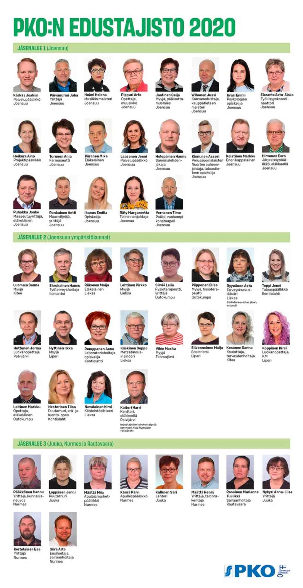 Ahokas Juha, digitalization lead, Joensuu Ihanus Emilia, yhteiskuntatieteiden opiskelija, Joensuu Kaalimaa Emmi, opettaja, Kitee Keinänen Anssi, professori, Liperi Kokkonen Pekka, maatilayrittäjä, Juuka Kortelainen Merja, maatalousyrittäjä, Valtimo Kurki Sallamari, erityisopettaja, Ilomantsi Laasonen Jenni, palvelupäällikkö, Joensuu Lehtinen Pirkko, pääluottamusmies, Lieksa Melkko Satu, palveluesimies, Liperi Parviainen Kaija, vastaava uimahallityöntekijä, Kitee Pykäläinen Samuli, yrittäjä, Liperi Pyykkönen Markku, markkinointijohtaja, Kontiolahti Romo Salla, pastori, Joensuu Ryynänen Asta, lääkäri, Lieksa Sihvonen Arto, sivistysjohtaja, Nurmes Sinkkonen Janne, konemyyjä, Kontiolahti Sirviö Leila, yrittäjä, Outokumpu Tiippana Anu, kotitalouden lehtori, Joensuu (vpj) Timonen Leena, hallintojohtaja, Nurmes Wrange Kim, yliopettaja, Kontiolahti (pj)PKO:n edustajisto
