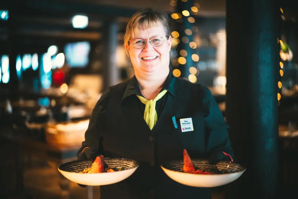Olen Tiina Pikkarainen. Työskentelen vuoropäällikkönä Bomban talossa ja Trattoria Pielisessä. Aloitin Bomban talossa noin 17 vuotta sitten. PKOlainen minusta tuli luonnollisesti vasta vuonna 2016, kun Bomban alue siirtyi Pohjois-Karjalan Osuuskaupalle. PKO rupesi määrätietoisesti kehittämään aluetta ja minulla on ollut etuoikeus olla mukana kehittämistyössä.Tämän työn yksi parhaimpia puolia ovat työtehtävien moninaisuus ja onnistuneen palvelukokonaisuuden mahdollistaminen meidän asiakkaille. Työvuorossani huolehdin meidän ihanista asiakkaistamme. Ohjaan heidät pöytään, suosittelen heille ruuat, katsomme yhdessä sopivat ruokajuomat ja huolehdin heidän hyvinvoinnista muutenkin.PKO on työnantajana luotettava, vakavarainen ja työntekijöistään huolta pitävä. Erityisen iloinen ja tyytyväinen olen ollut myös esihenkilöiden tuesta. Se on ollut kannustavaa ja motivoivaa. Meillä on myös erinomaiset henkilöstöedut. Tykkään itse matkustella paljon, joten omia suosikkejani ovat hotelli- ja ravintolaedut.Pitkän työurani aikana on ehtinyt tapahtua paljon. Olen pyrkinyt aina myös kehittämään ammattitaitoani pidemmälle esimerkiksi työn ohessa opiskellen. Olen suorittanut hotelli-, ravintola- ja suurtalousesimiehen erikoisammattitutkinnon sekä liiketalouden merkonomin tutkinnon. Mieleenpainuneita tilanteita on vuosien varrelta monia. Päällimmäisenä on tietenkin aviomieheni kosinta palvelutilanteessa sekä tuoreimpana PRO-finaaliin pääseminen.Jokaisessa työpaikassa on erityispiirteensä. Meillä PKO:ssa työnkuvan kehittäminen lähtee jokaisesta työntekijästä. Siksi tämä on minun näköinen työpaikka.Julkaistu vuonna 2022.